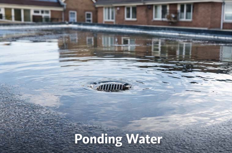 One of the most common issues with poorly drained flat roofs is ponding water. Ponding occurs when water collects on the roof and remains there for more than 48 hours after rainfall. Standing water can gradually weaken roofing materials, particularly older felt systems, and increase the likelihood of leaks.